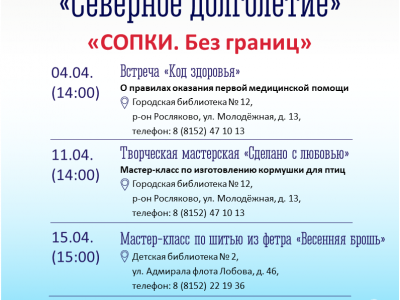 4 апреля, 14:00, р-н Росляково, ул. Молодежная, 13 (городская библиотека № 12, тел. 47-10-13). Тематическая встреча «Код здоровья».