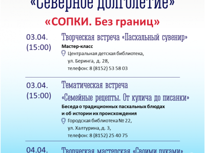 3 апреля, 15:00, ул. Халтурина, 3 (городская библиотека № 22, тел. 25-40-75). Тематическая встреча «Семейные рецепты. От кулича до писанки».