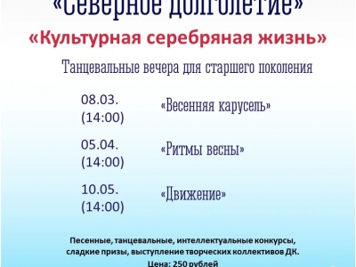 Каждое воскресенье, 15:00, Центр современной культуры и творчества (ул. Зои Космодемьянской, 2а, 24-57-34) Занятия хореографического коллектива «СеверПляс» для серебряного возраста. Предварительная запись обязательна.
