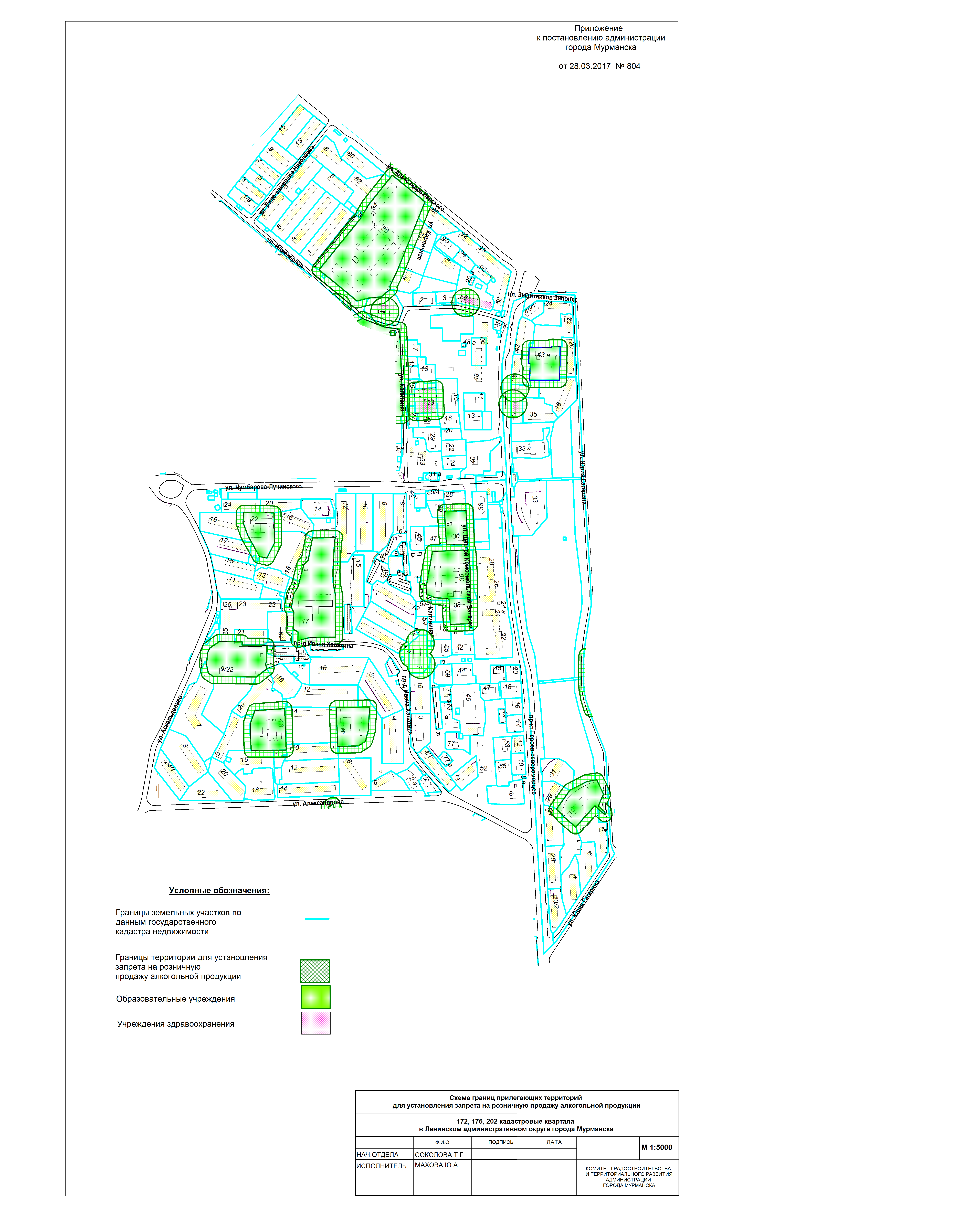 О внесении изменений в приложение к постановлению администрации города Мурманска от 23.05.2013 № 1201 "Об установлении границ прилегающих территорий для установления запрета на розничную продажу алкогольной продукции в 173 кадастровом квартале в Ленинском административном округе города Мурманска" |