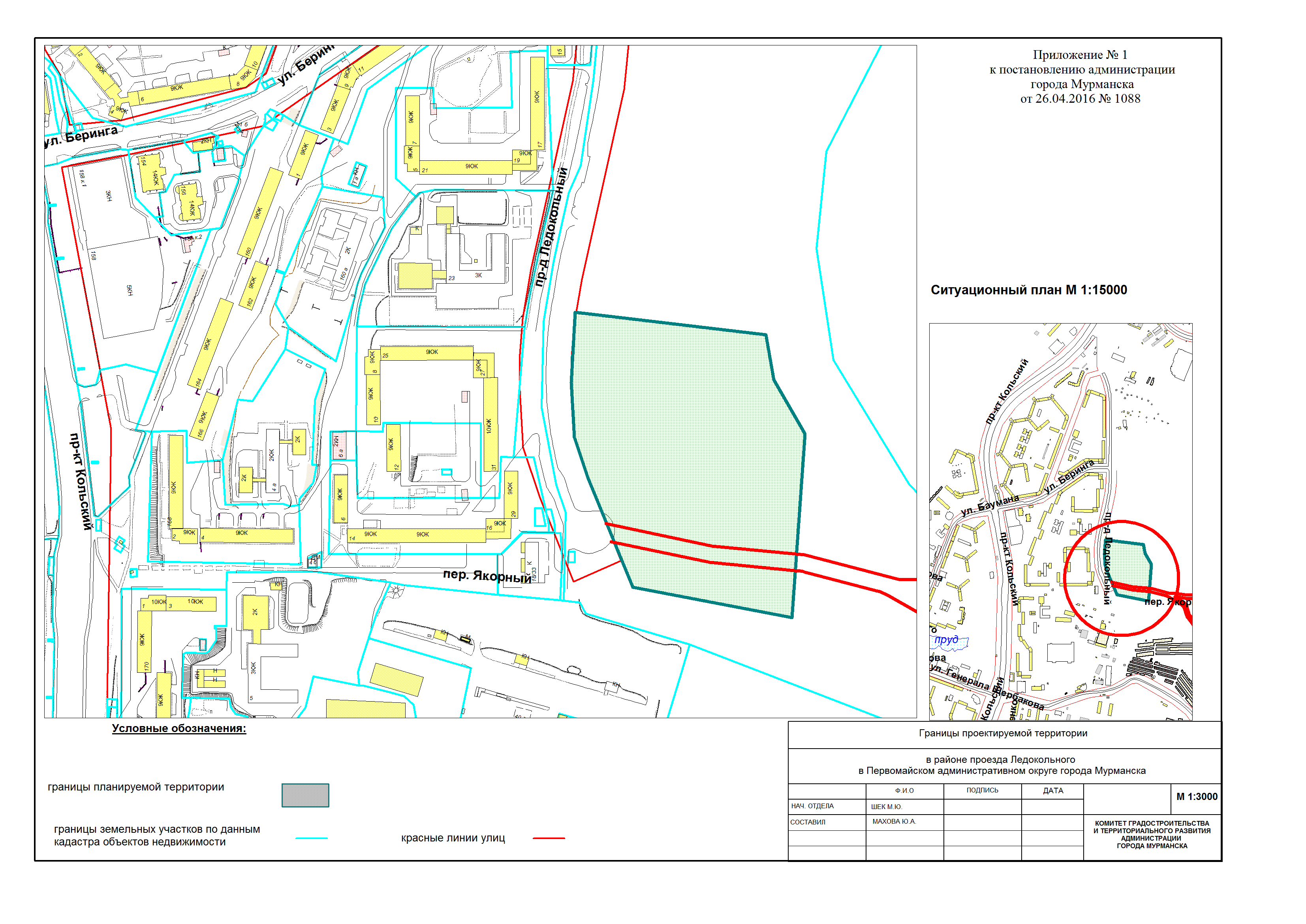 | № 1144 | 29.04.2016 | Об утверждении градостроительного плана земельного участка, расположенного в Первомайском административном округе города Мурманска, по проезду Ледокольному |
