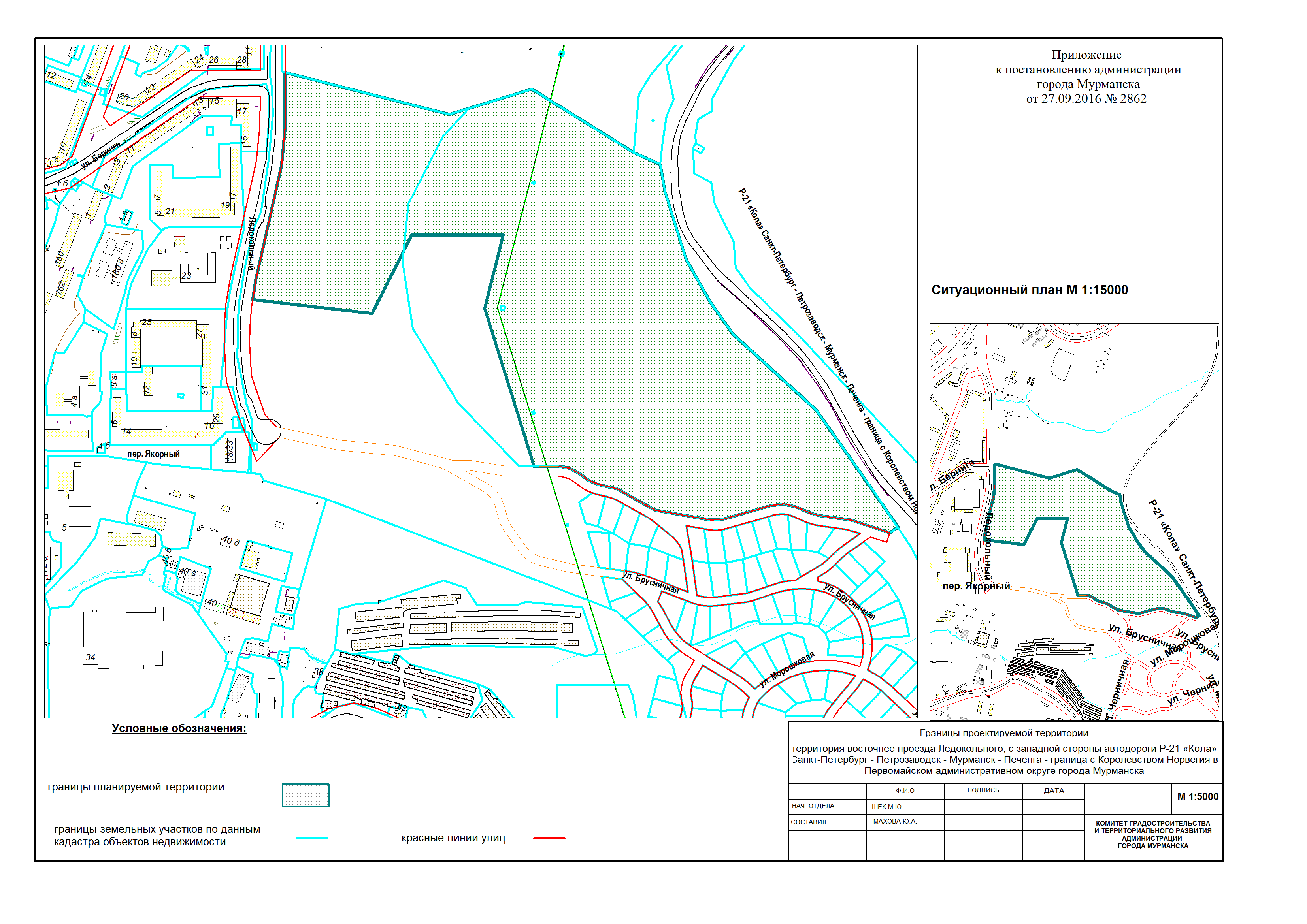 О подготовке проекта планировки и межевания территории, расположенной восточнее проезда Ледокольного, с западной стороны автодороги Р-21 "Кола" Санкт-Петербург-Петрозаводск - Мурманск - Печенга - граница с Королевством Норвегии в Первомайском административном округе города Мурманска |