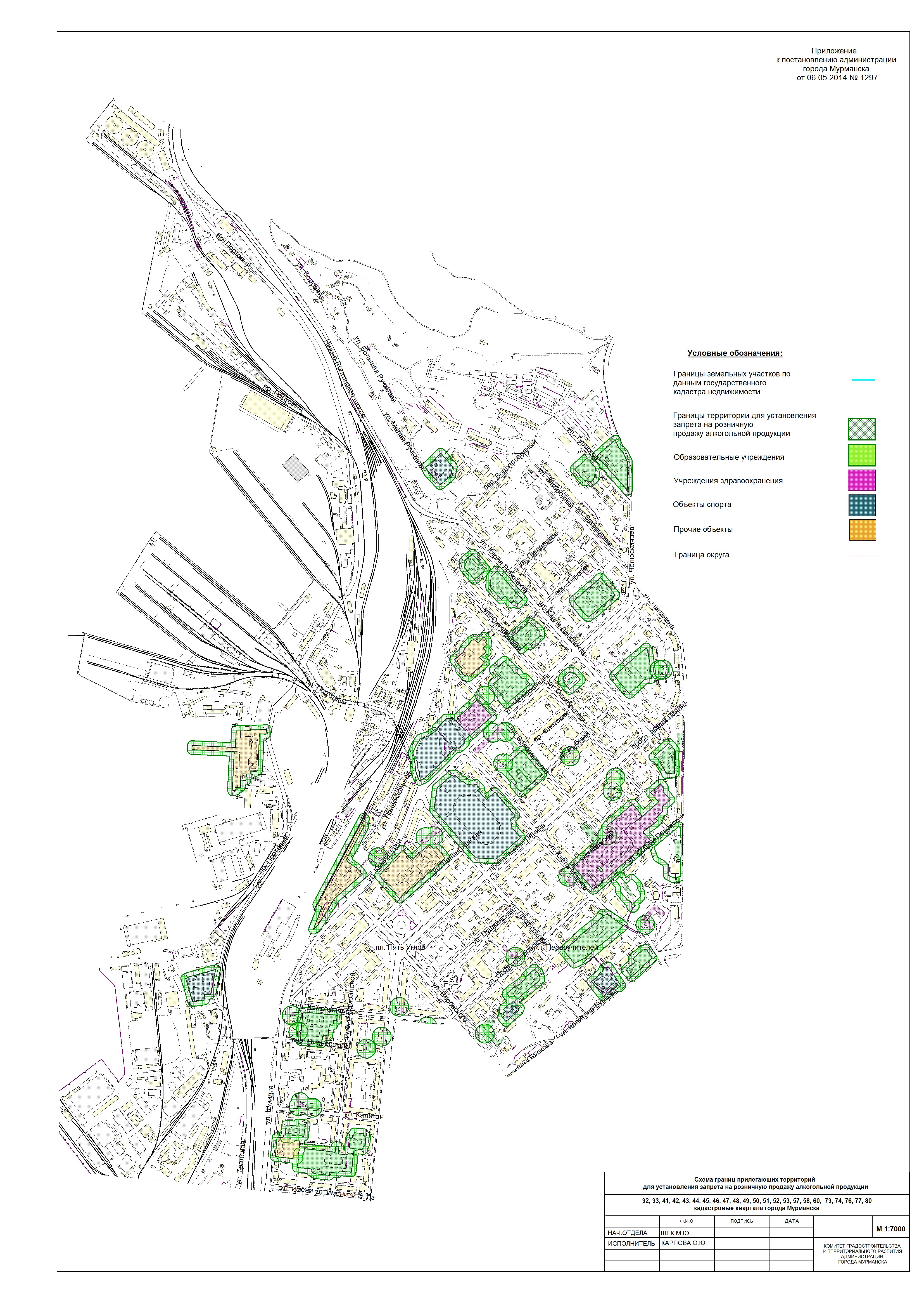 О внесении изменений в приложения № 1 и № 2 к постановлению администрации города Мурманска от 05.09.2013 № 2290 «Об установлении границ прилегающих территорий для установления запрета на розничную продажу алкогольной продукции в 32, 33, 41, 42, 43, 44, 45, 46, 47, 48, 49, 50, 51, 52, 53, 57, 58, 60, 73, 74, 76, 77, 80 кадастровых кварталах города Мурманска» |