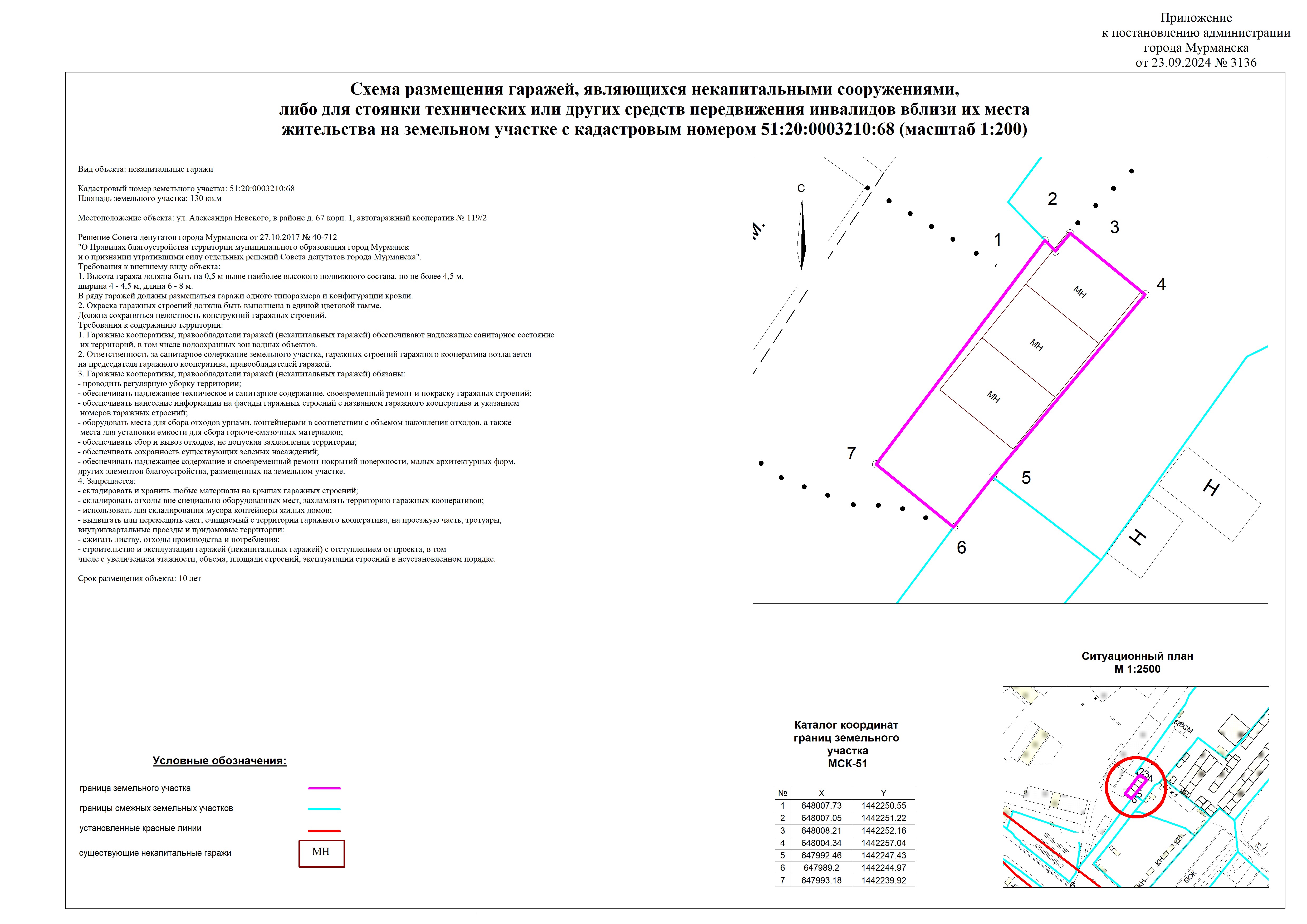 Об утверждении схемы размещения гаражей, являющихся некапитальными сооружениями, либо для стоянки технических или других средств передвижения инвалидов вблизи их места жительства на земельном участке с кадастровым номером 51:20:0003210:68 |