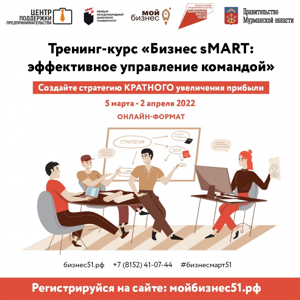 Центр «Мой бизнес» в партнерстве с Первым международным цифровым университетом в рамках программ поддержки малого и среднего предпринимательства с 5 марта по 2 апреля 2022 года проводит бесплатный онлайн-курс обучения для предпринимателей Мурманской области «Бизнес sMART: эффективное управление командой».