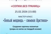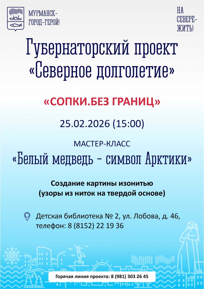 25 февраля, 15.00, ул. Адмирала флота Лобова, 46 (детская библиотека № 2, тел. 22-19-36). Мастер-класс «Белый медведь — символ Арктики»: создание картины изонитью (узоры из ниток на твердой основе).