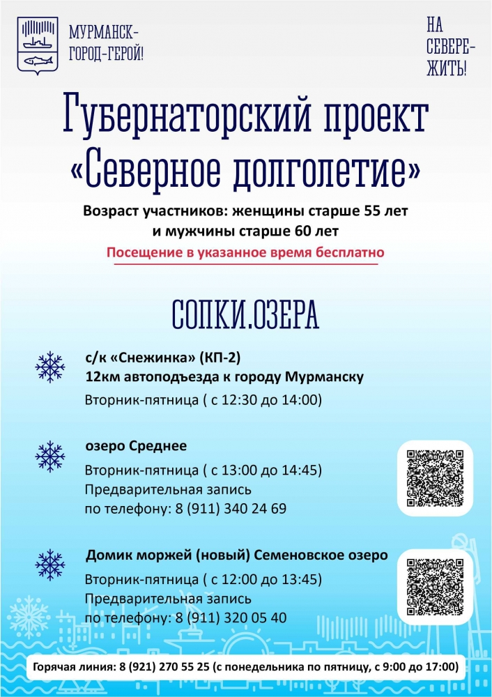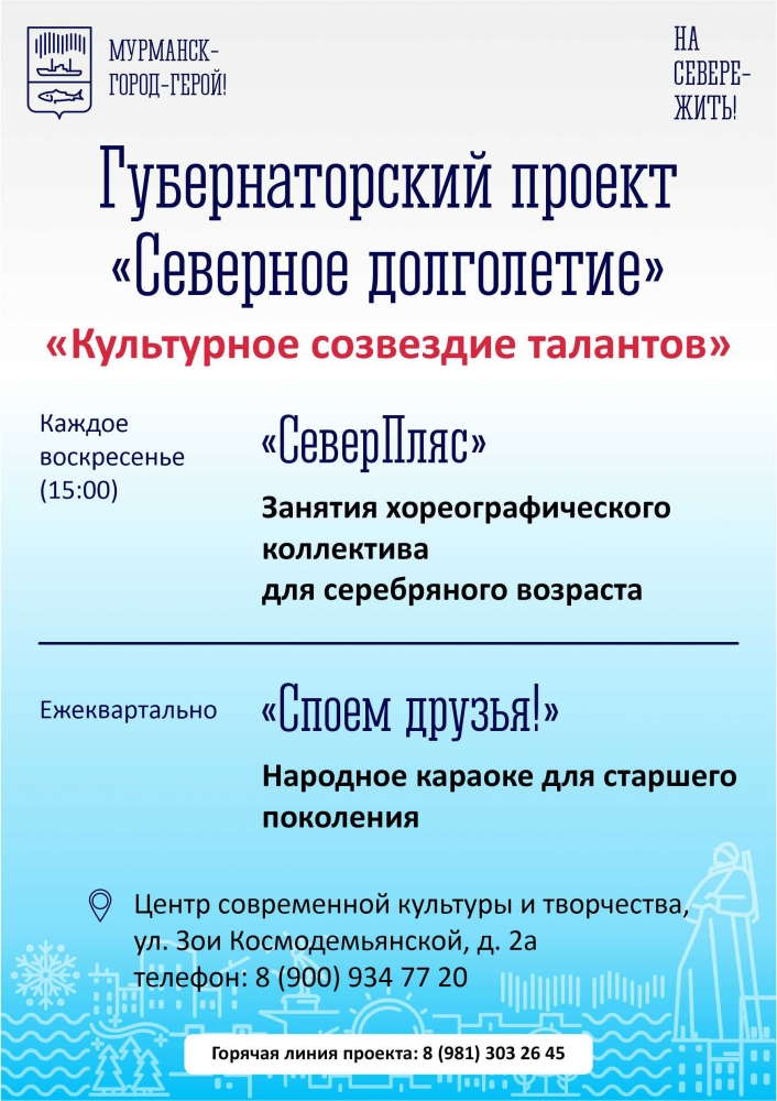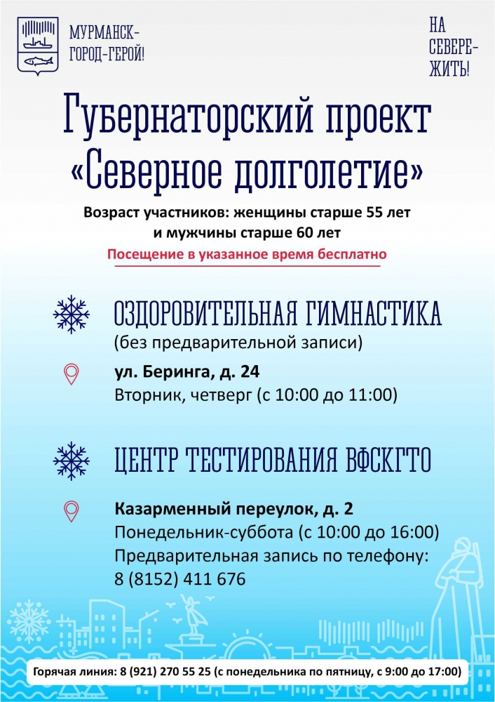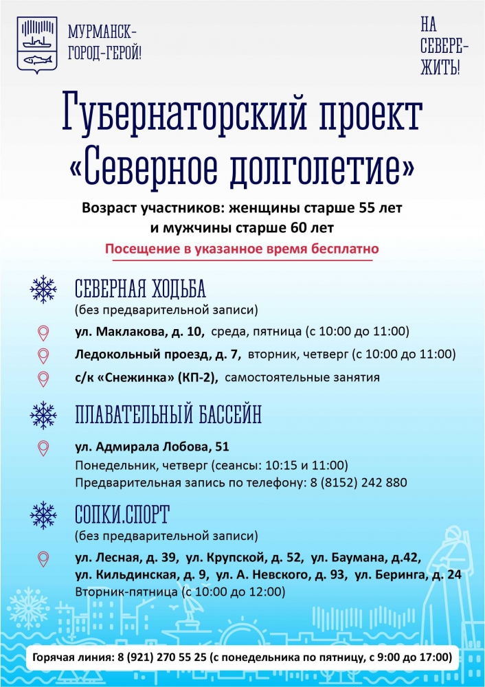 В Кольском Заполярье в рамках стратегического плана «На Севере — жить!» реализуется проект «Северное долголетие», инициированный губернатором Мурманской области Андреем Чибисом. Цель проекта— содействие и помощь северянам старшего поколения в поддержании здоровья и активного образа жизни.