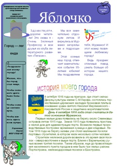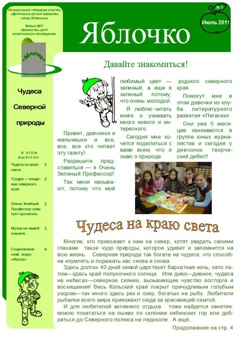 – в филиале №17 вышли в свет уже два номера газеты «Яблочко». Первый номер посвящен природе северного края, второй – рассказывает об истории города, там же помещены поздравления ребят. Материалы для газеты готовились юными журналистами из клуба литературного развития «Пегасик», который успешно работает в библиотеке.