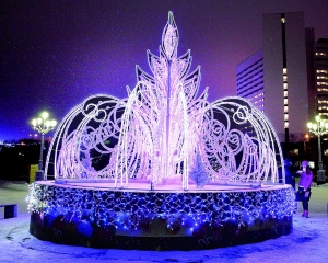 Новым бриллиантом в праздничной короне столицы Заполярья стал световой фонтан в сквере у Дворца культуры имени Кирова. Его размеры довольно внушительные - пять метров в диаметре и четыре с половиной метра в высоту, и он по праву стал центральным элементом иллюминации парка.