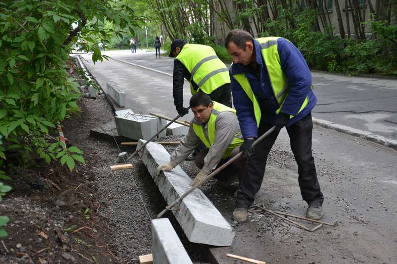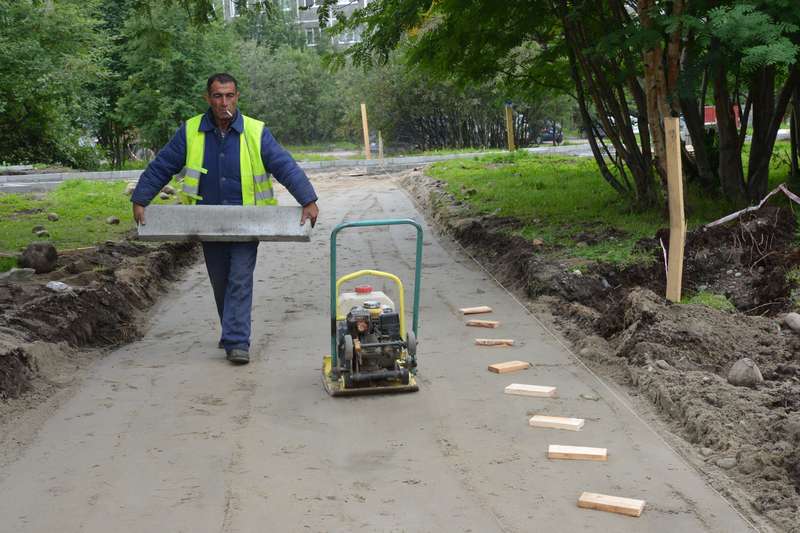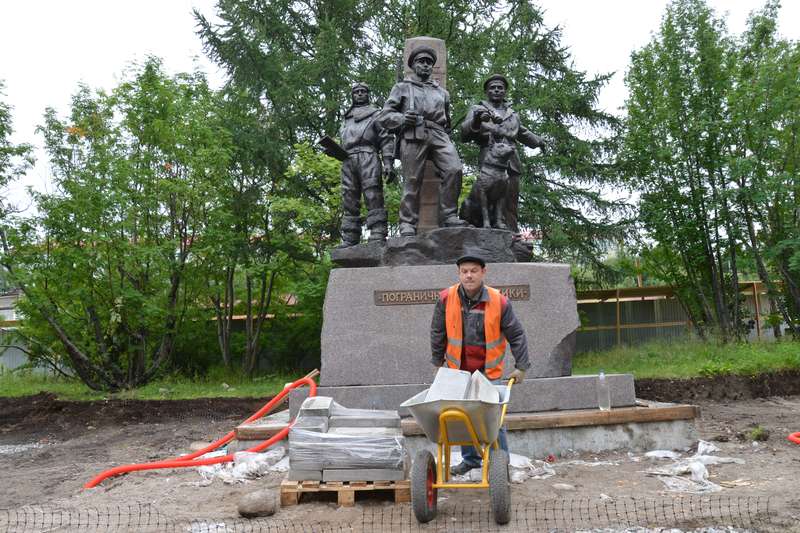 Полностью завершена планировка сквера у драмтеатра. Сдать объект, по словам старшего прораба Сергея Дурягина, планируется к концу августа. Сейчас строители устанавливают бетонные поребрики. Обещают, что мощение тротуарной плиткой будет очень красивым. По краям дорожки и аллеи "оденут" в красное, а их середину - в серое. Красную тротуарную плитку уложат и вокруг памятника "Пограничникам Арктики". В зеленой зоне установят 14 новых светильников и сделают к памятнику подсветку.