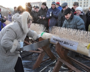 Однако совсем скоро внимание мурманчан было всецело отдано главному герою праздника - деревянному "бюджету". Ведь оставались считанные минуты до его распила. Доверили эту ответственную миссию жителям города, пришедшим на праздник.