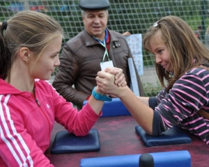 Пока одни осваивали технику игры в петанк, другие сосредоточились на более серьезном занятии под названием кроссфит. Что это такое, продемонстрировала пара крепких парней. Они без остановки прошли два цикла упражнений, включающих в себя отжимание, тягу гири к подбородку, жим штанги стоя и, самое интересное, отбивание огромной покрышки железными молотами. Силовое многоборье подхватили юные гиревики, которые поднимали, подбрасывали и ловили разнокалиберные гири. Вдохновившись спортивной подготовкой этих ребят, многие гости праздника захотели посоревноваться друг с другом в армрестлинге. Специально для этого вида спорта был установлен стол с подлокотниками и ручками для упора.