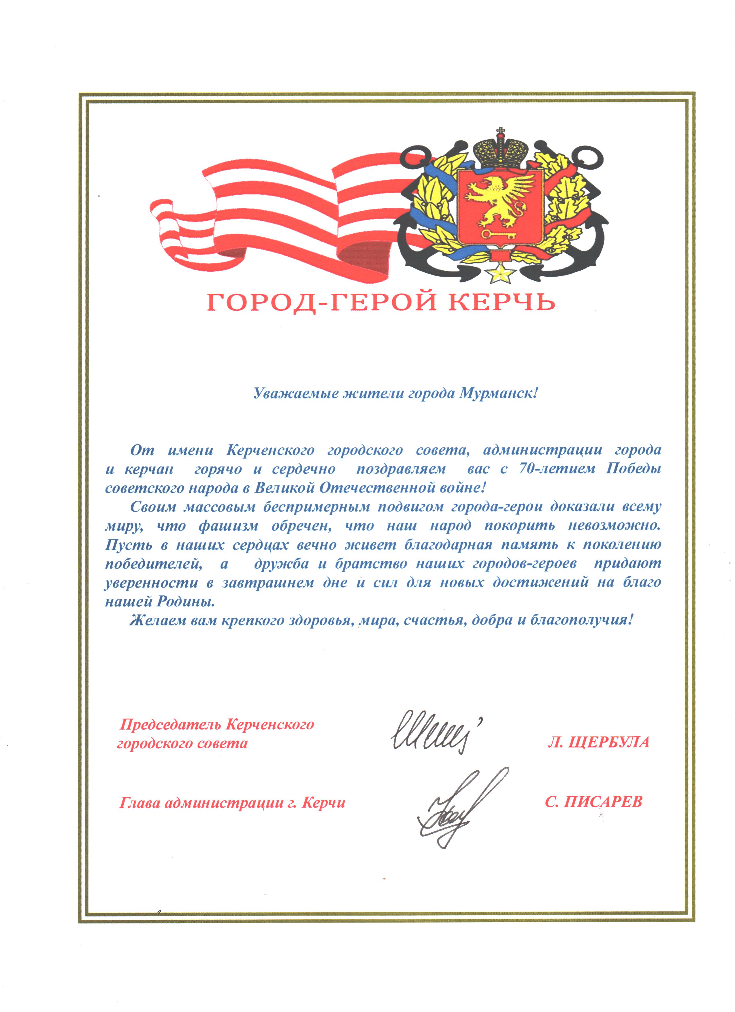 От имени Керченского городского Совета, администрации города и керчан горячо и сердечно поздравляем вас с 70-летием Победы советского народа в Великой Отечественной войне!