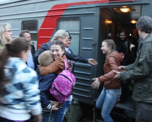 Как только состав прибыл к платформе и проводница распахнула вагонную дверь, радостные школьники выбежали на перрон в объятия родных и близких.
