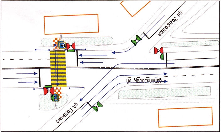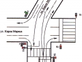 Светофорный объект будет работать в трех фазах (см. схему). Кроме того, пешеходный переход на улице Карла Маркса, сейчас расположенный ближе к перекрестку, для удобства пешеходов и автомобилистов будет перенесен на двадцать метров в сторону пересечения с улицей Полярные Зори. Пешеходный переход будет регулируемым.