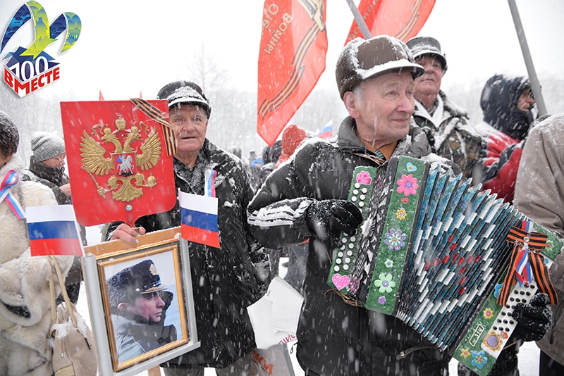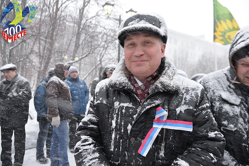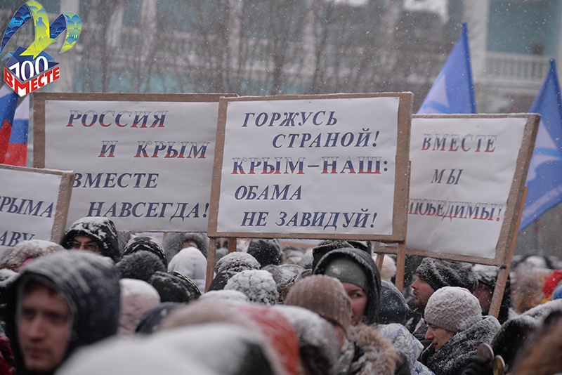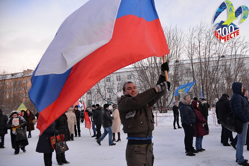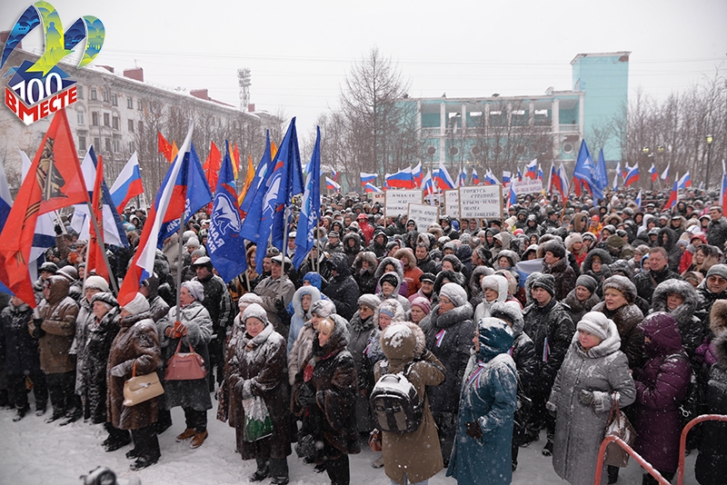 Сегодня в Мурманске состоялся торжественный митинг, посвященный воссоединению Крыма и города-героя Севастополя с Россией. Несмотря на ненастную погоду, выразить свою гражданскую позицию пришли 3000 человек. Организатором выступило мурманское региональное отделение Общероссийского народного фронта.