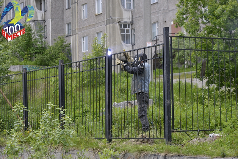 Так, около школы № 53 (ул. Папанина, 3) устанавливают новое ограждение. Для безопасности юных мурманчан в скором времени здесь появится система видеонаблюдения.