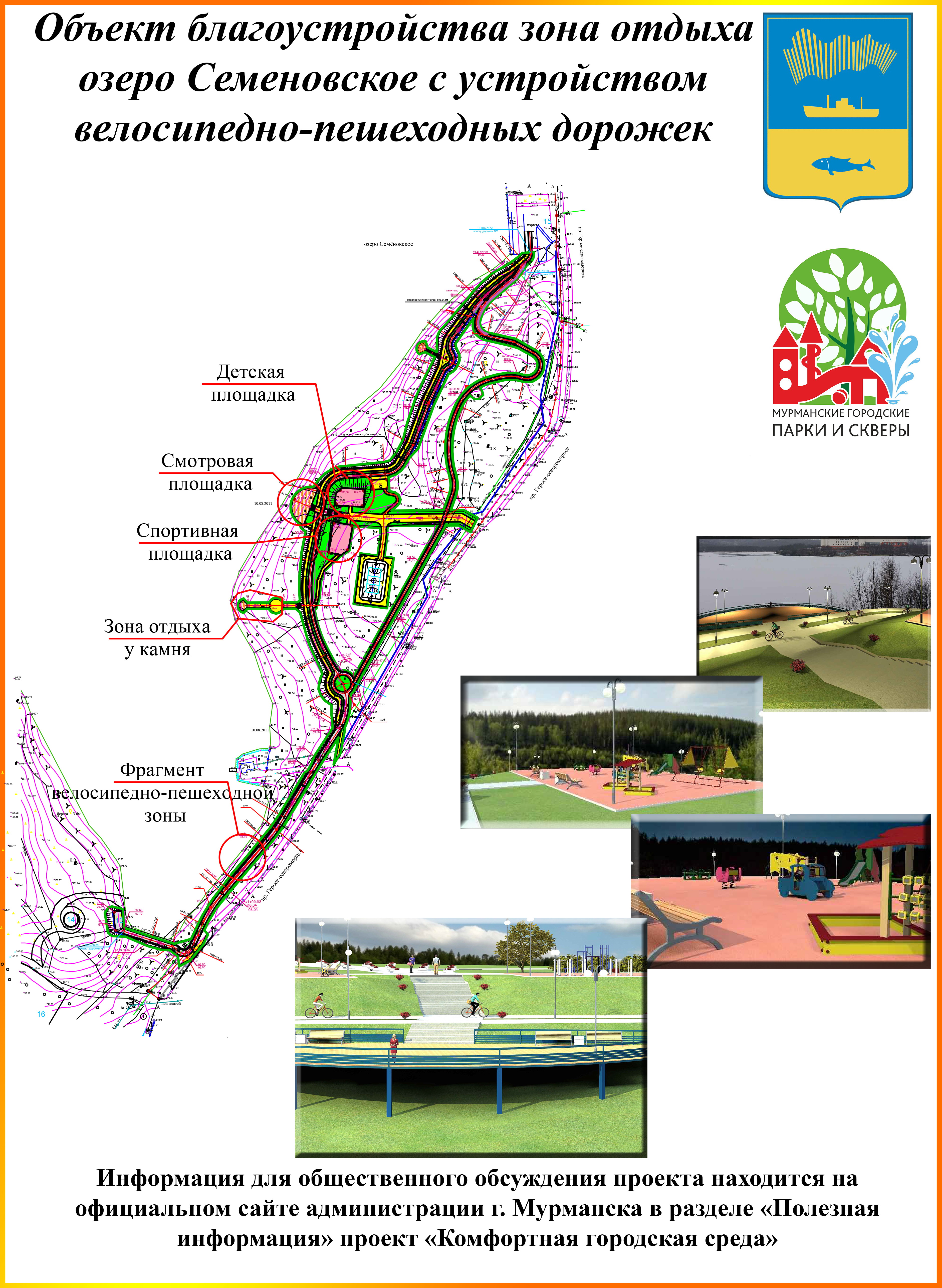 Комитет по культуре администрации города Мурманска в соответствии с постановлением администрации города Мурманска от 16.03.2017 № 633 «Об утверждении Порядка разработки, обсуждения с заинтересованными лицами и утверждения дизайн-проектов благоустройства дворовых территорий, а также дизайн-проектов благоустройства общественных территорий, расположенных на территории муниципального образования город Мурманск» уведомляет о начале проведения общественного обсуждения и сбора предложений и замечаний от граждан в отношении дизайн-проекта по благоустройству зоны отдыха озера Семёновского с устройством велосипедно-пешеходных дорожек.
