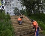 На улице Папанина рядом с домом №24 сотрудники муниципального учреждения «Управление дорожного хозяйства» завершают работы по обновлению пешеходной лестницы.