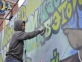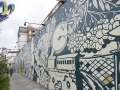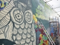 Подарок ко Дню города приготовила группа мастеров граффити – 6 художников, 4 дизайнера и оператор. Они разработали эскиз будущего 50-метрового «полотна» и сделали разметку, спроецировали на стену различные фотографии Мурманска и прорисовывали их линии на бетонном «холсте». Для создания масштабного рисунка райтерам понабилось порядка 1200 баллонов краски.