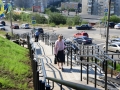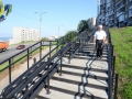 Деревянный настил самой лестницы покрыт специальной огнебиозащитной пропиткой, также установлены перильные ограждения и пандус. Такие конструкции по сравнению с бетонными легче поддаются чистке и ремонту, хорошо зарекомендовали себя в эксплуатации, безопасны и комфортны для пешеходов.