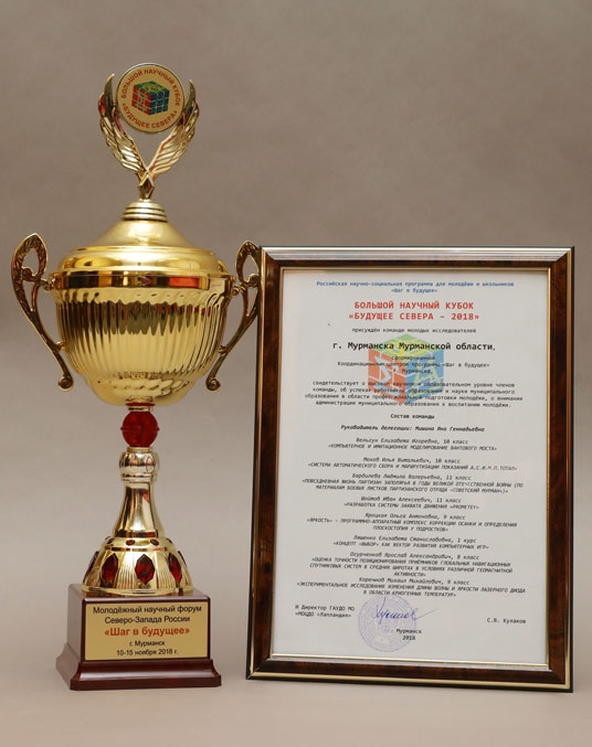 Абсолютными победителями признаны Никита Якубец из Мурманского академического лицея и Людмила Бардилева из гимназии № 1. Команда города Мурманска в составе Людмилы Бардилевой, Елизаветы Вельгун, Ольги Яроцкой, Ивана Шойтова, Ильи Мохова, Михаила Кореннова и Ярослава Огурченкова стала обладателем Большого научного кубка «Будущее Севера». Мурманск на «Шаге в будущее» представляли более 90 учащихся образовательных учреждений города, которые соперничали с молодыми учеными Санкт-Петербурга, Ленинградской, Калининградской, Архангельской областей, а также Республики Карелия, Ненецкого автономного округа. Ребята в возрасте от 9 до 19 лет представили более 350 проектов.