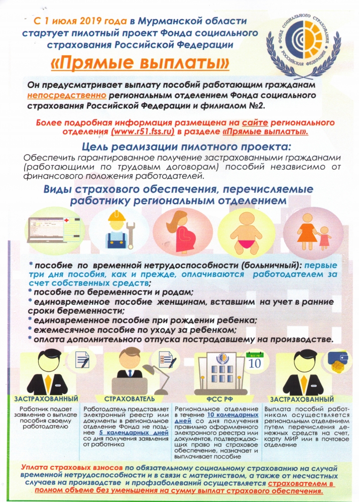 Мурманское региональное отделение Фонда социального страхования Российской Федерации информирует, что в соответствии с постановлением Правительства Российской Федерации от 01 декабря 2018 № 1459 с 01 июля 2019 года на территории Мурманской области начнется реализация пилотного проекта «Прямые выплаты».