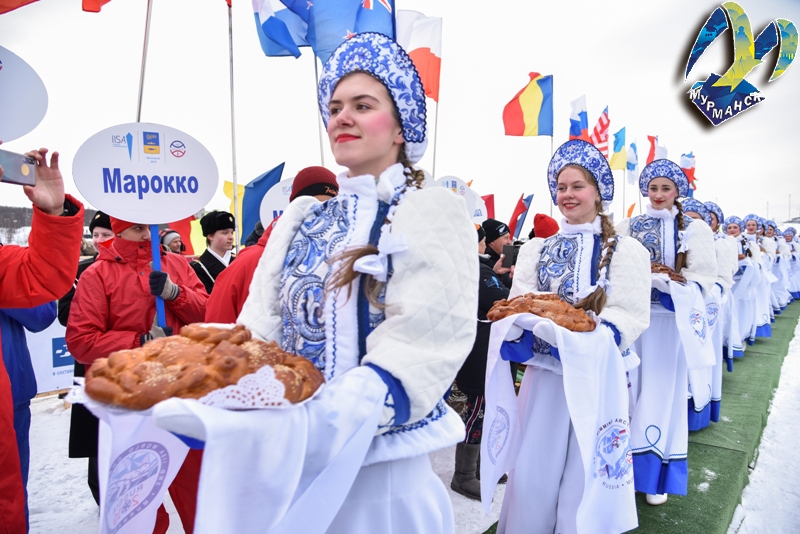 На международных соревнованиях в Мурманске собрались 400 спортсменов их 32 стран мира. По русской традиции делегации приветствовали румяными караваями.