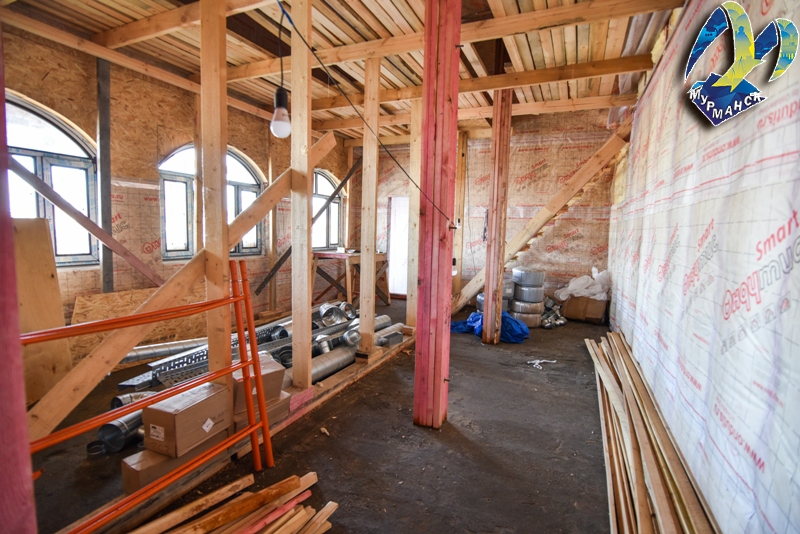 Уже выполнен монтаж наружных и внутренних стен, а также монтаж строительных конструкций крыши, оконных блоков. В настоящее время строители занимаются изоляцией стен и кровли здания, внутренней обшивкой стен и кровли, устройством коммуникаций.