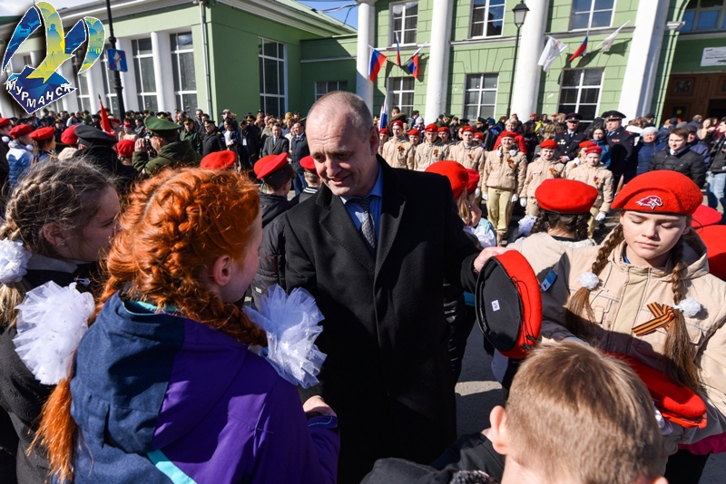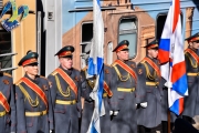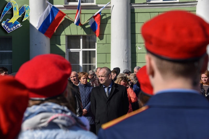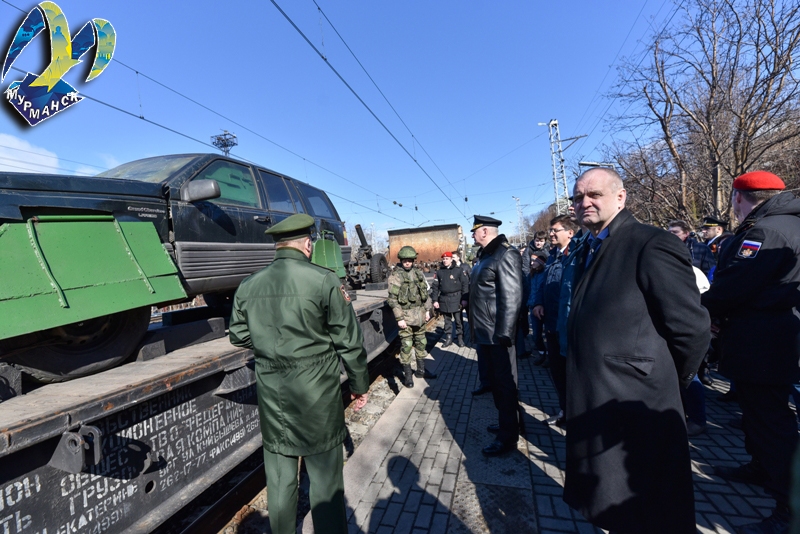 На перроне железнодорожного вокзала начальника воинского эшелона, полковника Владимира Перепелицу приветствовали глава администрации города Мурманска Андрей Сысоев и глава муниципального образования город Мурманск Тамара Прямикова.