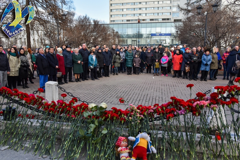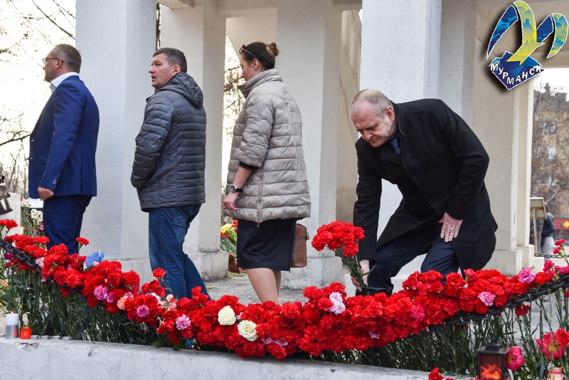 В восемь вечера, когда в сквере у памятника собрались сотни мурманчан, митрополит Мурманский и Мончегорский Митрофан провел молебен в память о погибших. В Мурманском порту прозвучал протяжный гудок, который поддержали проезжающие мимо автомобилисты.