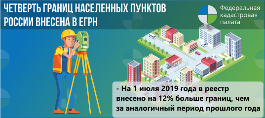 На 1 июля 2019 года количество сведений о границах населенных пунктов, внесенных в ЕГРН, составляет 39,4 тыс., что на 12% больше по сравнению с началом текущего года. За первое полугодие 2019 года в ЕГРН внесены сведения о 4,2 тыс. границ населенных пунктов. По состоянию на конец II квартала 2019 года в ЕГРН содержатся сведения о 25,3% границ населенных пунктов. Общее количество населенных пунктов в Российской Федерации — 155,7 тыс.