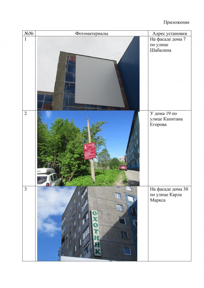 Комитет градостроительства и территориального развития администрации города Мурманска сообщает о выявлении рекламных конструкций, установленных в нарушение требований Федерального закона от 13.03.2006 № 38-ФЗ «О рекламе», владельцы которых не установлены. Владельцы указанных ниже рекламных конструкций обязаны осуществить демонтаж рекламных конструкций в течение месяца со дня публикации настоящей информации и фотоматериалов в официальном печатном издании администрации города Мурманска – газете «Вечерний Мурманск», на официальном сайте администрации города Мурманска citymurmansk.ru, а также выполнить полное комплексное восстановление нарушенных покрытий объектов и элементов благоустроиства территории и провести уборку прилегающей территории в соответствии с пунктами 10.3.8.8, 10.3.8.9 Правил благоустройства территории муниципального образования город Мурманск, утвержденных решением Совета депутатов города Мурманска от 27.10.2017 № 40-712.