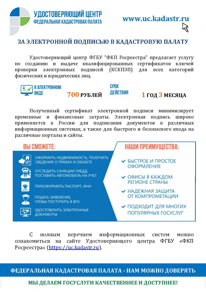 С полным перечнем информационных систем можно ознакомиться на сайте Удостоверяющего центра ФГБУ "ФКП Росреестра" uc.kadastr.ru
