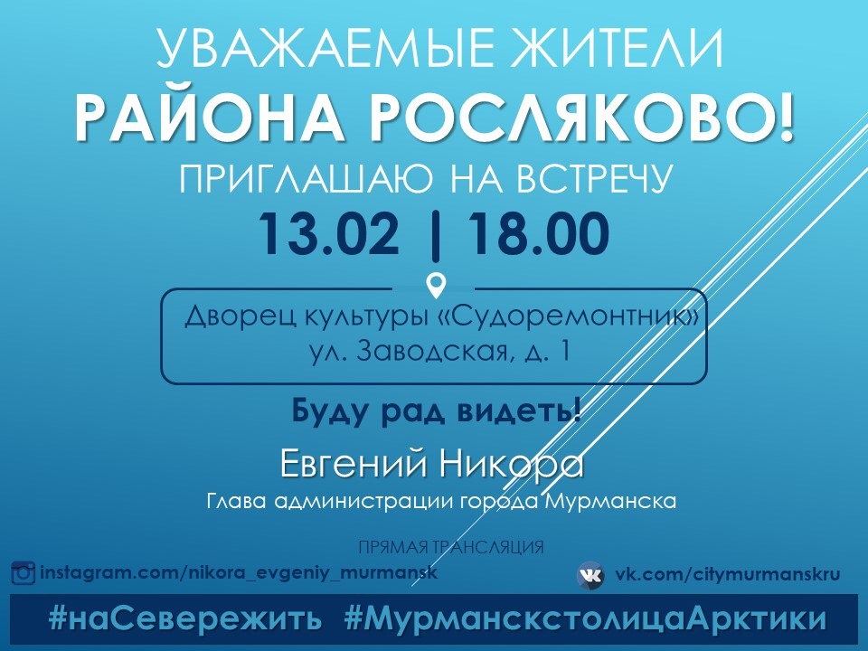 Также сообщаем, что встреча будет транслироваться в социальных сетях по ссылкам: instagram.com/nikora_evgeniy_murmansk и vk.com/citymurmanskru.