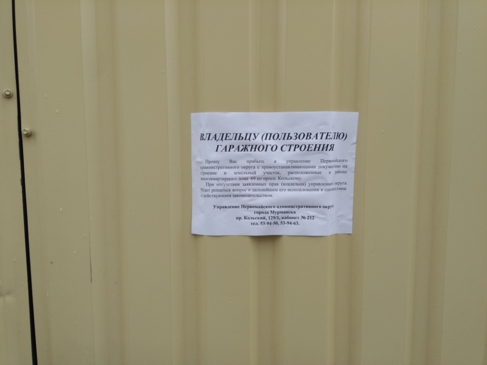 Управление Первомайского административного округа города Мурманска просит владельцев/пользователей гаражных строений и металлического контейнера, расположенных в районе многоквартирного дома 69 по просп. Кольскому в течение одного месяца (со дня опубликования объявления) предоставить правоустанавливающие документы на гаражные строения и занимаемый земельный участок в отдел по взаимодействию со структурами жилищно-коммунального комплекса и благоустройству по адресу: просп. Кольский, 129/1, кабинет № 212, контактные телефоны: