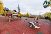 Площадка выполнена из современных безопасных материалов. Она состоит из четырех башен с мостиками, качелей, песочницы и других игровых конструкций.