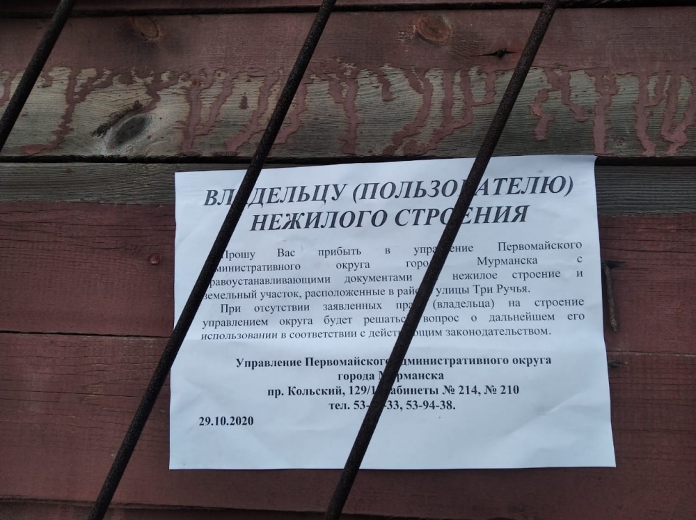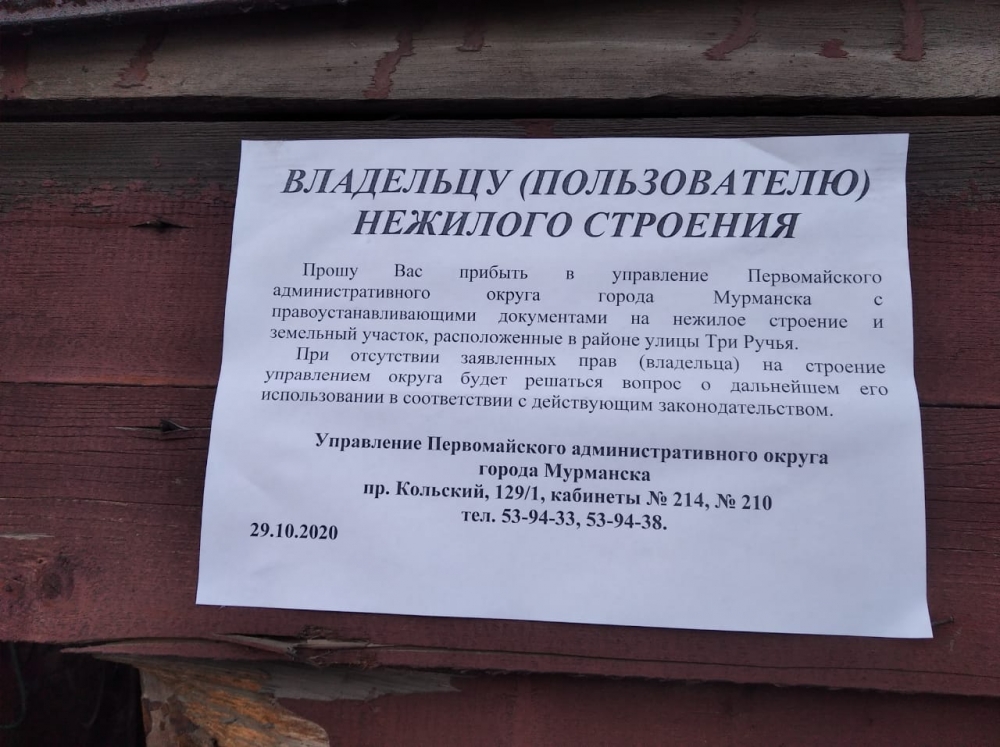 Управление Первомайского административного округа города Мурманска просит владельца/пользователя нежилого строения, расположенного в районе здания 24 по ул. Три Ручья, в течение одного месяца (со дня опубликования объявления) предоставить правоустанавливающие документы на строение в отдел по взаимодействию со структурами жилищно-коммунального комплекса и благоустройству по адресу: пр. Кольский, 129/1, кабинеты № 212, № 214, контактные телефоны: 53-94-06, 53-94-50, 53-94-63.