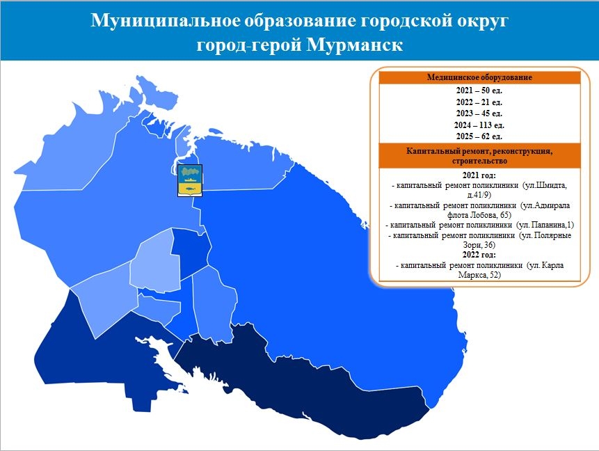 Так, по информации министерства здравоохранения Мурманской области, в 2021 году планируется капитальный ремонт поликлиник на ул. Шмидта, 41/9, ул. Адмирала флота Лобова, 65, ул. Папанина, 1 и ул. Полярные Зори, 36. Также в этом году планируется оснащение (переоснащение) учреждений медицинским оборудованием в количестве 50 единиц.
