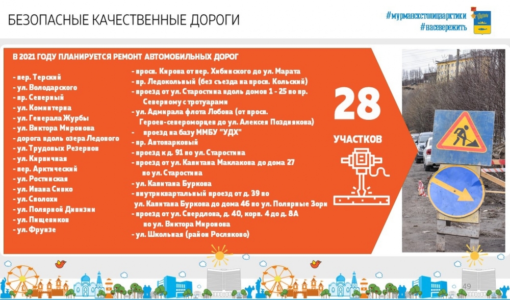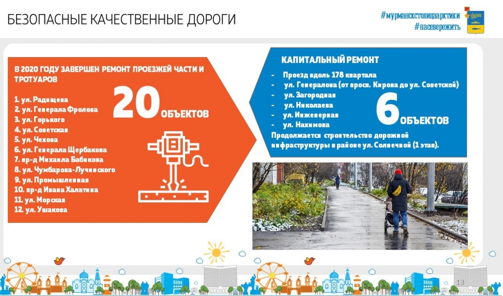 В завершающей части доклада Евгений Никора озвучил ключевые задачи на среднесрочную перспективу. Это преодоление последствий пандемии, в частности, поддержка малого и среднего предпринимательства, переселение граждан из аварийных домов, домов пониженной капитальности, имеющих не все виды благоустройства, а также предоставление социальной поддержки для улучшения жилищных условий молодым и многодетным семьям. В 2021 году продолжится благоустройство дворовых и городских и территорий в рамках регионального проекта «Формирование комфортной городской среды». Предусмотрено благоустройство 22 дворовых территорий и двух общественных территорий: территории в районе дома 101 по проспекту Кольскому и сквера у памятника В. И. Ленину. В рамках реализации национального проекта «Безопасные качественные дороги» в 2021 году запланирован ремонт проезжей части на 28 участках автомобильных дорог.