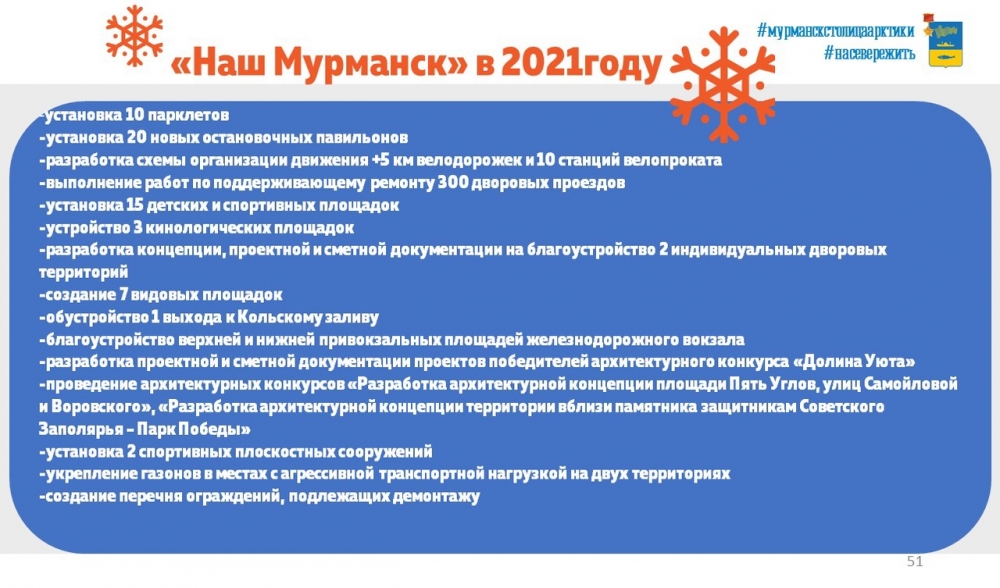 — В среднесрочной перспективе перед органами местного самоуправления открываются новые вызовы и новые возможности для развития города Мурманска как города высокого качества жизни и комфортной городской среды проживания, а также для укрепления его позиций в качестве делового центра развития Арктической зоны Российской Федерации, — подытожил Евгений Викторович.