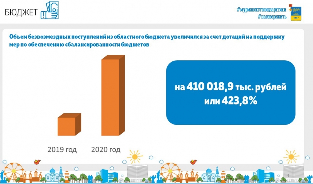 Глава администрации областного центра отметил, что бюджет муниципального образования город Мурманск сохраняет социальную направленность. 60,5% расходов бюджета — на социальную сферу. Общий объем доходов бюджета муниципального образования город Мурманск в 2020 году составил 16 622 102,5 тыс. рублей, это на 7,7% больше, чем в 2019 году. При этом он обратил внимание, что на рост объема безвозмездных поступлений на 22% , который произошел благодаря поддержке правительства Мурманской области.