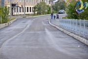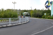 Подрядчик закончил монтаж пешеходных оцинкованных ограждений, установку бортовых камней, устройство верхнего слоя асфальтобетонного покрытия проезжей части и тротуаров.