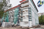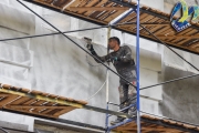 На сегодня уже выполнена большая часть работ по ремонту кровли, проложены наружные сети канализации, выполнена гидроизоляция фундамента здания со стороны двора. Сейчас строители занимаются нанесением теплоизоляционного покрытия на фасад здания.