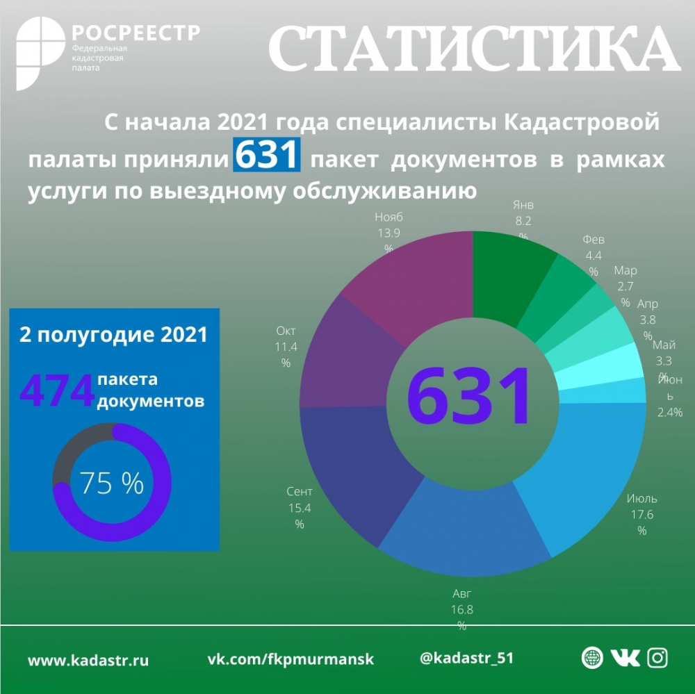 С начала 2021 года специалисты Кадастровой палаты по Мурманской области приняли 631 пакет документов в рамках выездов к заявителям. Из них 75% (474 пакета документов) приняты во втором полугодии 2021 года.