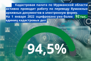 По итогам 2021 года план Кадастровой палаты по Мурманской области по цифровизации архива выполнен на 100%. На сегодняшний день отсканировано более 92 тыс. кадастровых дел, что составляет более 94% от общего количества дел, находящихся на хранении в бумажном виде.