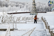 Содержание территорий осуществляют две подрядные организации. Ежедневно в зимний период на уборку объектов выходят 72 человека и девять единиц специализированной техники, в том числе три самосвала. Только за январь 2022 года вывезено 9500 кубометров снега.