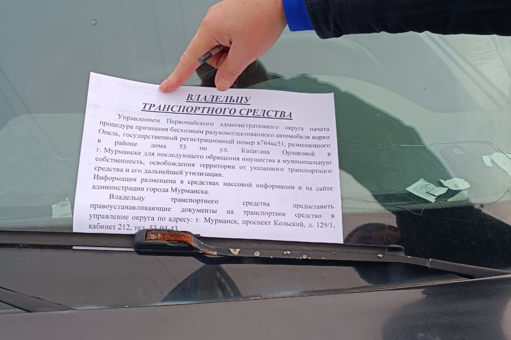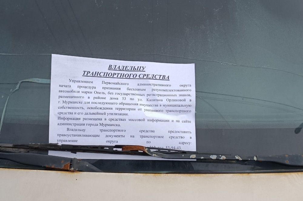 Управление Первомайского административного округа города Мурманска просит владельца транспортного средства марки Опель (без государственных регистрационных знаков), расположенного со стороны торцевого фасада многоквартирного дома № 53 по ул. Капитана Орликовой предоставить правоустанавливающие документы на транспортное средство в отдел по контролю за исполнением административного законодательства по адресу: просп. Кольский, 129/1 (кабинет № 212, контактный телефон: 53-94-43).