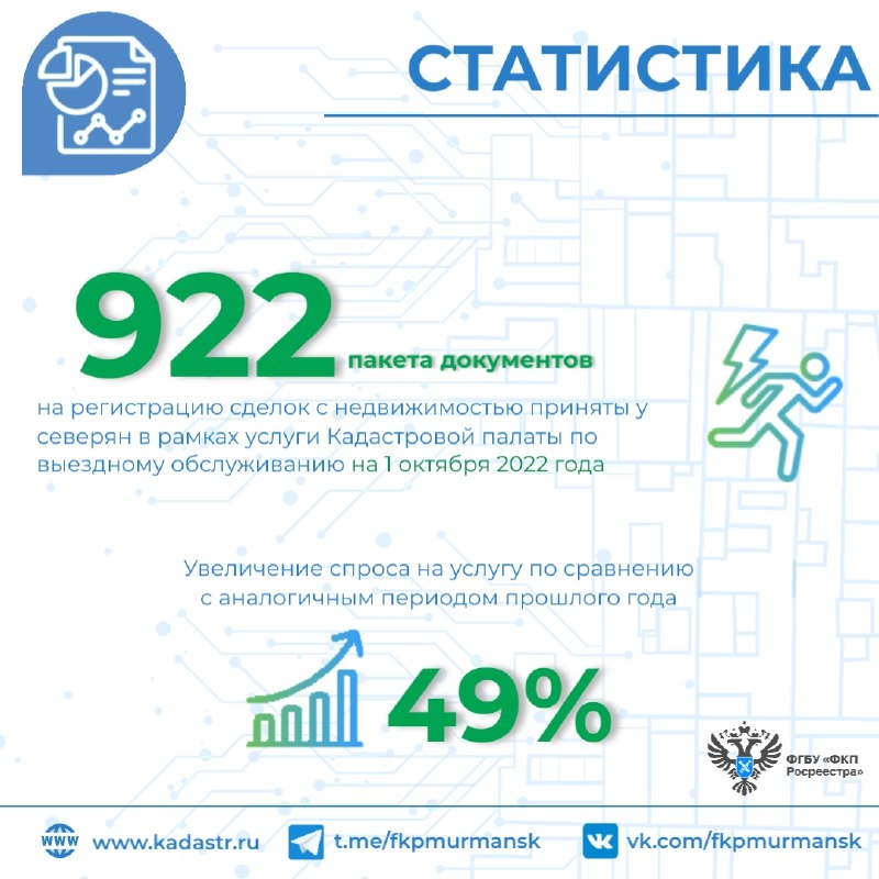 С начала года специалисты Кадастровой палаты по Мурманской области приняли 922 пакета документов в рамках выездов к заявителям. В сравнении с аналогичным периодом 2021 года количество выездов увеличилось на 49%. Кроме того, в сентябре два выезда были осуществлены бесплатно по заявкам правообладателей-инвалидов II группы.