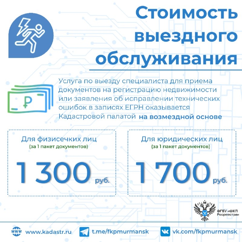 Напомним, выездное обслуживание позволяет быстро и безопасно совершить любую сделку с недвижимостью не выходя из дома или офиса. Специалисты Кадастровой палаты готовы принять документы на регистрацию недвижимости или заявления об исправлении технических ошибок в записях ЕГРН и выехать: